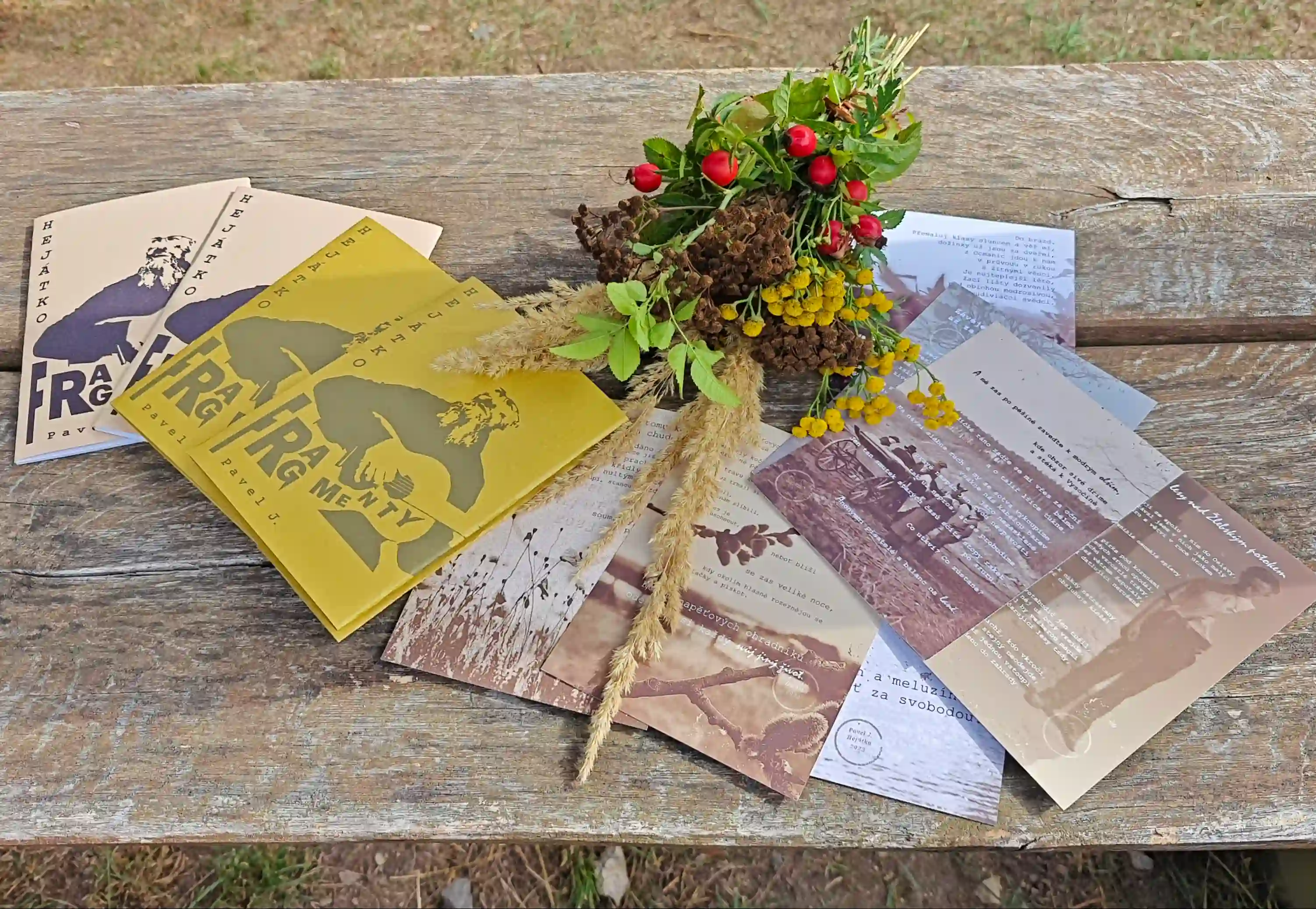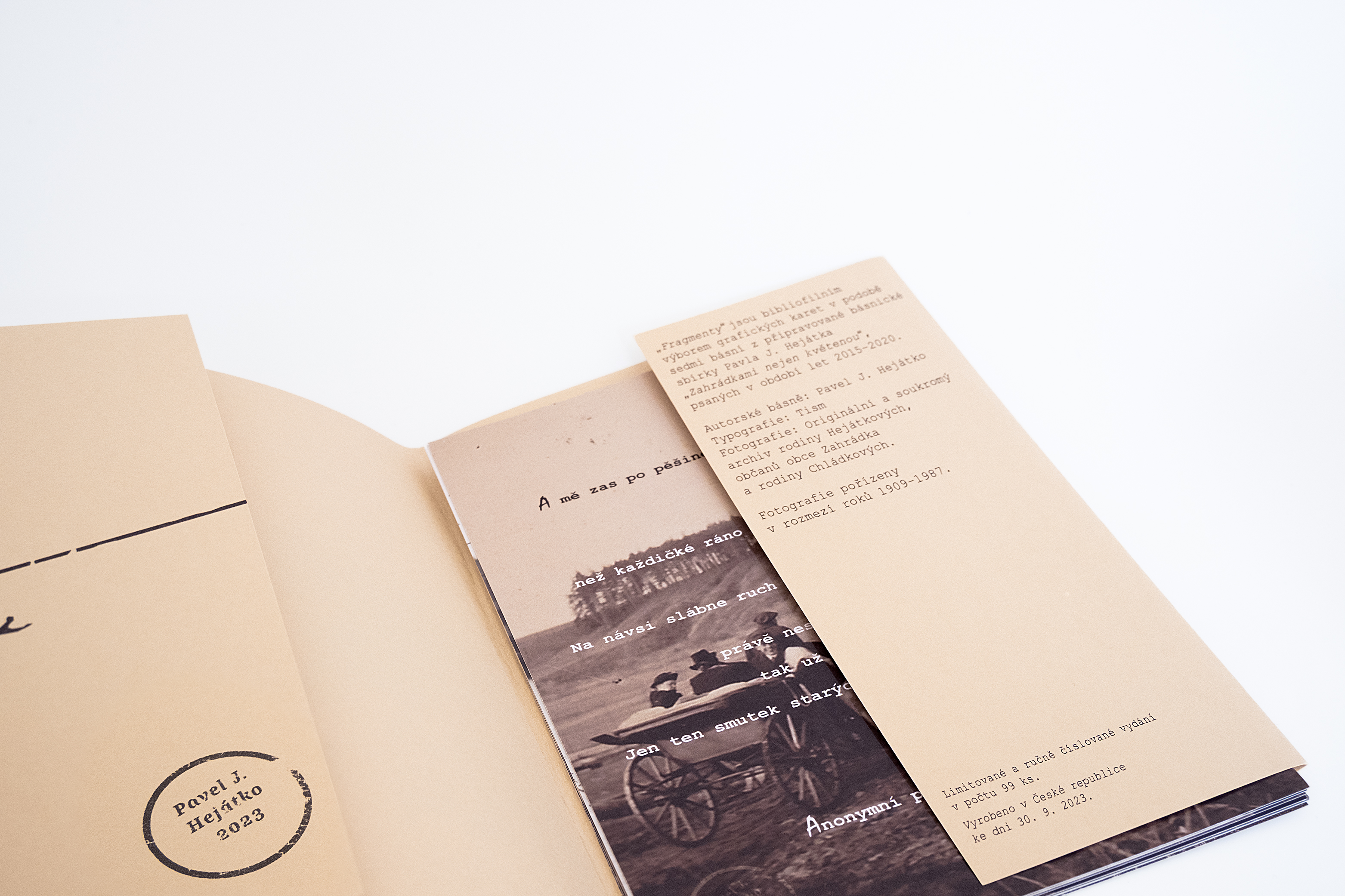 Publikace Fragmenty vyšla mecenášským darem jako bibliofilie v roce 2023 v nákladu 99 kusů. Každý výtisk je ručně číslován a signován autorem. Fotografie pocházejí z osobních archivů místních obyvatel, kteří je pro tento soubor poskytli, a přirozeně tak dotvářejí jeho autentický charakter.